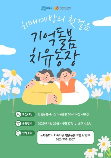 남동구보건소는 인천농업기술센터, 논현종합사회복지관과 손잡고 치매 고위험군 어르신을 대상으로 하는 치유농업 기반 인지·정서 지원 프로그램을 2026년부터 본격 추진한다고 21일 밝혔다.