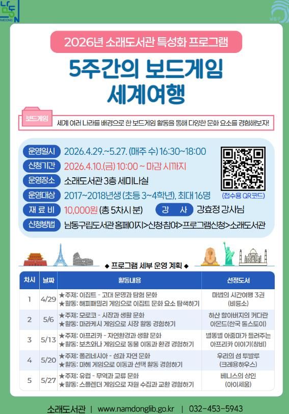 【뉴스라이트 = 이세현 기자】 인천시 남동남동구립도서관은 지역주민들에게 다채로운 독서문화 체험의 장을 제공하기 위해 ‘2026년 특성화 프로그램’을 운영한다고 22일 밝혔다.