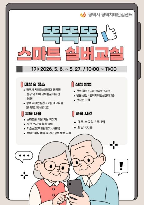 【뉴스라이트 = 박현서 기자】 평택치매안심센터는 오는 5월 6일부터 27일까지 치매 예방 및 인지 기능 강화를 위한 ‘똑똑똑 스마트 실버교실’을 운영한다고 밝혔다.