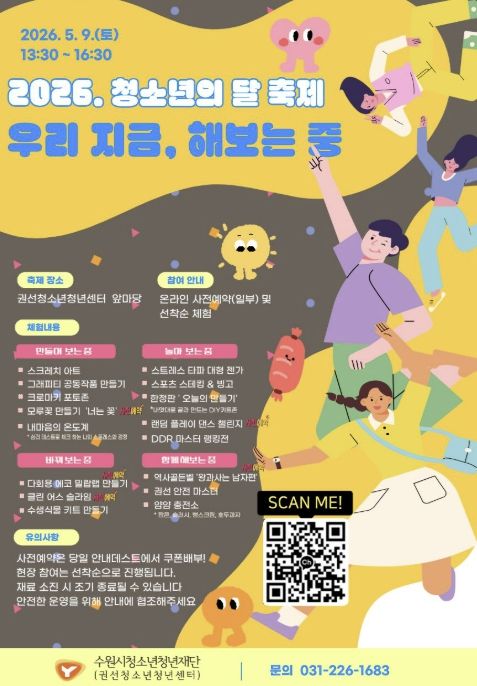 【뉴스라이트 = 조용은 기자】 수원시청소년청년재단 권선청소년청년센터가 오는 5월 9일, 청소년이 주인공이 되어 직접 경험하고 도전하는 참여형 축제 ‘지금우리, 해보는중’을 개최한다고 밝혔다.