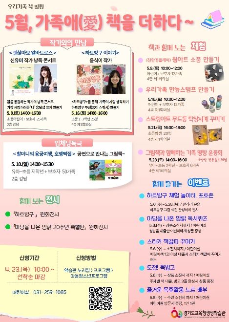 【뉴스라이트 = 한경준 기자】 경기도교육청평생학습관이 가족 사랑 실천과 가족 간 유대감 증진을 위해 가족 독서체험 행사인 䃵월, 가족애(愛) 책을 더하다’를 운영한다.