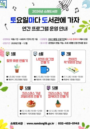 【뉴스라이트 = 이세현 기자】 인천시 남동구 소래도서관은 5월부터 12월까지‘2026년 토요일마다 도서관에 가자’행사를 개최한다고 23일 밝혔다.