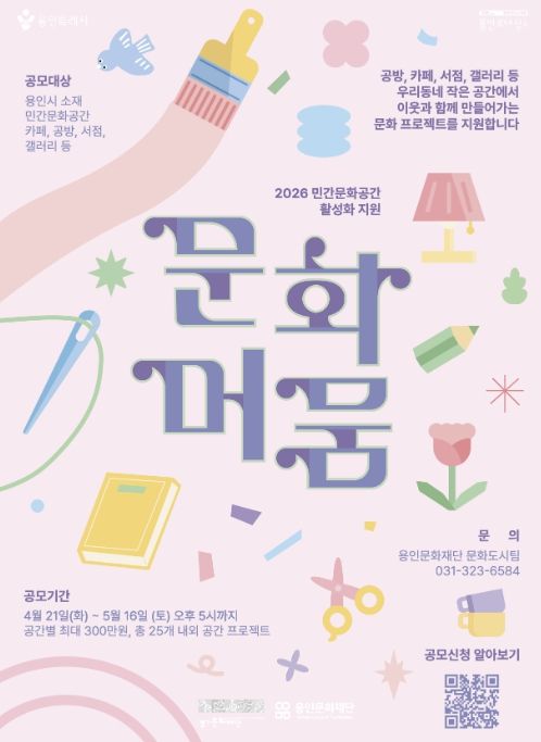 지원 자격은 용인시에 소재한 카페, 공방, 서점, 갤러리, 연습실, 작업실, 대안공간 등 민간문화공간이며, 신청은 4월 21일부터 5월 16일 오후 5시까지 이메일을 통해 접수하면 된다.