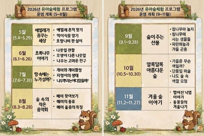한편, 유아숲체험원 프로그램은 4월부터 11월까지 운영되며 성주산 둥지(소사), 원미산 산울림(원미), 은데미(오정) 등 3개 유아숲체험원에서 진행된다. 회당 20명 이내 소규모로 운영해 안전성과 체험 집중도를 높이며 운영시간은 오전 9시 30분부터 11시 30분까지 2시간, 참가비는 무료다.