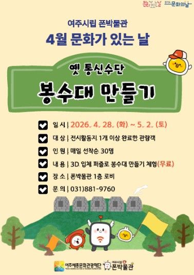 【뉴스라이트 = 김정민 기자】 여주세종문화관광재단이 운영하는 여주시립 폰박물관은 4월 '문화가 있는 날'을 맞아 오는 4월 28일부터 5월 2일까지 시민 참여형 체험 행사 '소식을 전하던 봉수대 만들기'를 운영한다.