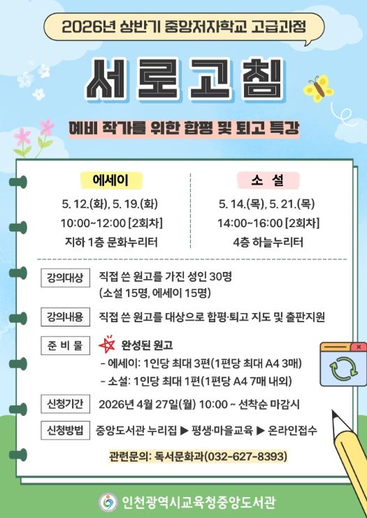 【뉴스라이트 = 이세현 기자】 인천광역시교육청중앙도서관은 4월 27일부터 예비 작가를 위한 ‘중앙저자학교 고급과정’ 참여자를 모집한다.