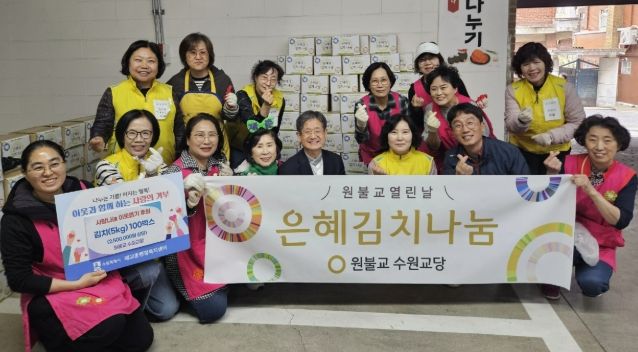 【뉴스라이트 = 조용은 기자】 수원시 팔달구 매교동은 지난 22일, 원불교 수원교당(교구장 김도천)으로부터 직접 담근 배추김치(5kg) 100박스를 기부받았다고 밝혔다.