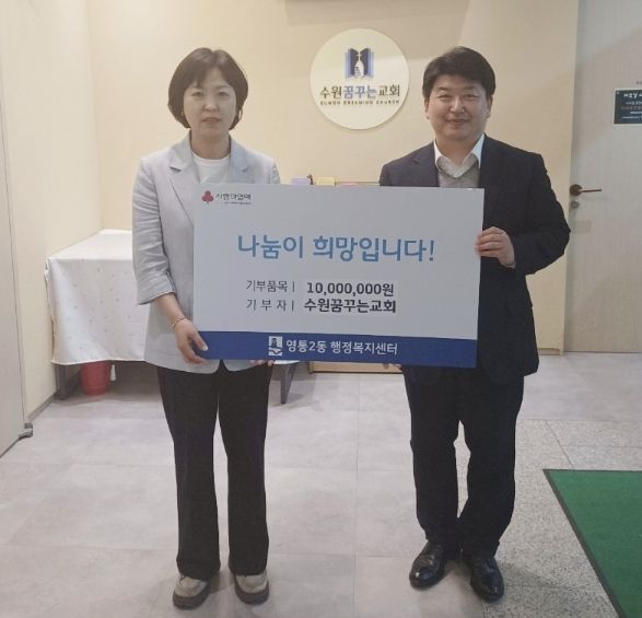 【뉴스라이트 = 조용은 기자】 수원시 영통구 영통2동은 지난 23일 수원꿈꾸는교회가 지역사회 내 취약계층 지원을 위해 교인들과 함께 모금한 사랑의 성금 1천만원을 영통2동 행정복지센터에 기부했다고 밝혔다.