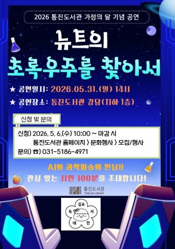 【뉴스라이트 = 이세현 기자】 김포시 통진도서관이 가정의 달을 맞아 온 가족이 함께 즐길 수 있는 공연 '뉴트의 초록우주를 찾아서'를 오는 5월 31일 오후 2시 통진도서관 강당에서 개최한다.
