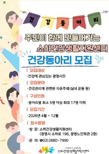 【뉴스라이트 = 이양지 기자】 광명시 소하건강생활지원센터가 시민 스스로 건강을 관리하고 실천하도록 돕기 위해 오는 12월까지 ‘주민참여형 건강동아리’를 상시 모집한다.
