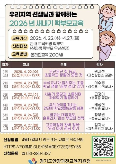【뉴스라이트 = 이양지 기자】 경기도안양과천교육지원청은 오는 4월 22부터 27일까지 관내 신입생 학부모를 대상으로 ‘우리지역 선생님과 함께하는 2026년 새내기 학부모 교육’을 개최한다.
