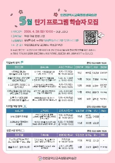 【뉴스라이트 = 이세현 기자】 인천광역시교육청평생학습관은 인천 시민에게 다양한 배움의 기회를 제공하기 위해 오는 28일부터 ‘5월 단기 평생교육 프로그램’ 학습자를 모집한다.