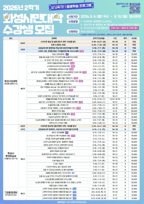 【뉴스라이트 = 조용은 기자】 화성특례시는 2026년 화성시민대학 2학기 수강생을 오는 5월 4일부터 5월 10일까지 선착순으로 모집한다고 밝혔다.