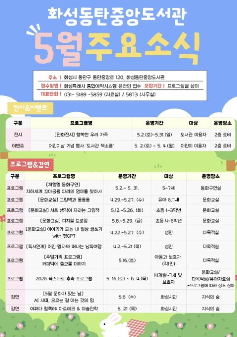 이번 행사는 화성동탄중앙도서관 개관 이후 처음 맞는 어린이날과 가정의 달을 기념해 마련됐다. 5월 2일부터 4일까지는 어린이날 기념 행사 ‘화성동탄중앙도서관 책소풍’을 운영하고, 5월 한 달 동안은 가족 친화형 체험·전시·독서문화 프로그램을 중심으로 다채로운 행사를 이어갈 예정이다.