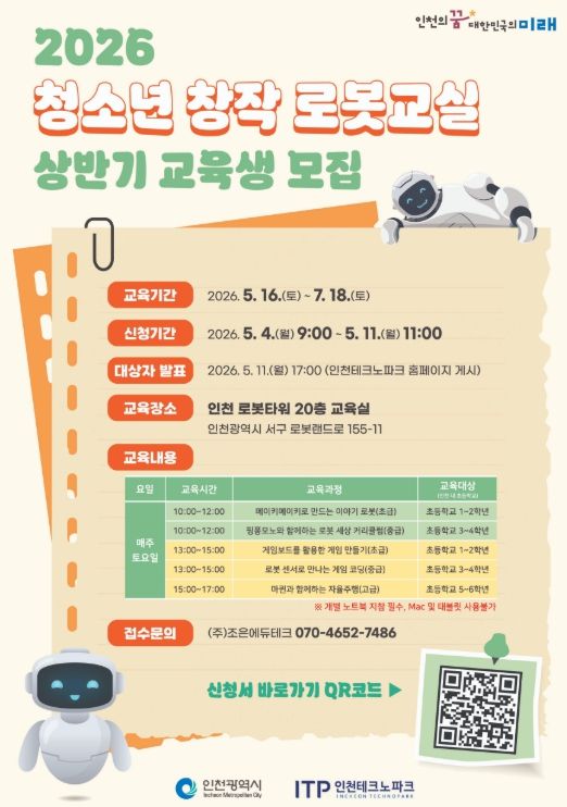 【뉴스라이트 = 이세현 기자】 인천테크노파크(인천TP)는 인천 관내 초등학생을 대상으로 로봇과 인공지능(AI)기술을 직접 체험하는 ‘2026년 청소년 창작 로봇교실’ 상반기 교육생을 5월 11일까지 모집한다고 밝혔다.