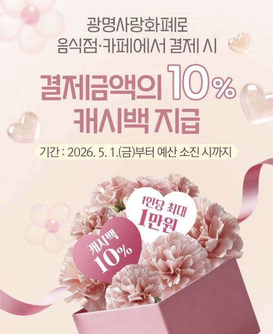【뉴스라이트 = 이양지 기자】 광명시가 5월 가정의 달을 맞아 가족 외식은 즐겁게, 골목상권은 활기차게 만드는 특별한 캐시백 혜택을 제공한다.