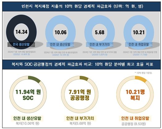 분석결과에 따르면, 2024년 기준 인천시 복지재정은 약 8.2조 원의 생산유발효과, 4.3조 원의 부가가치, 7만 1천 명의 취업유발효과를 창출한 것으로 나타났다.