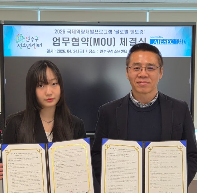 【뉴스라이트 = 이세현 기자】 (재)연수구청소년재단 연수구청소년센터는 지난 24일 센터에서 AIESEC in INHA와 ‘2026 국제역량 개발 프로그램 글로벌 멘토링’을 위한 업무협약(MOU)을 체결했다.