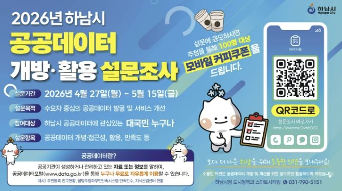 【뉴스라이트 = 김정민 기자】 하남시는 시민과 기업, 연구기관 등 다양한 수요자의 의견을 반영해 공공데이터 개방 및 활용을 확대하고자 ‘2026년 하남시 공공데이터 설문조사’를 실시한다고 밝혔다.