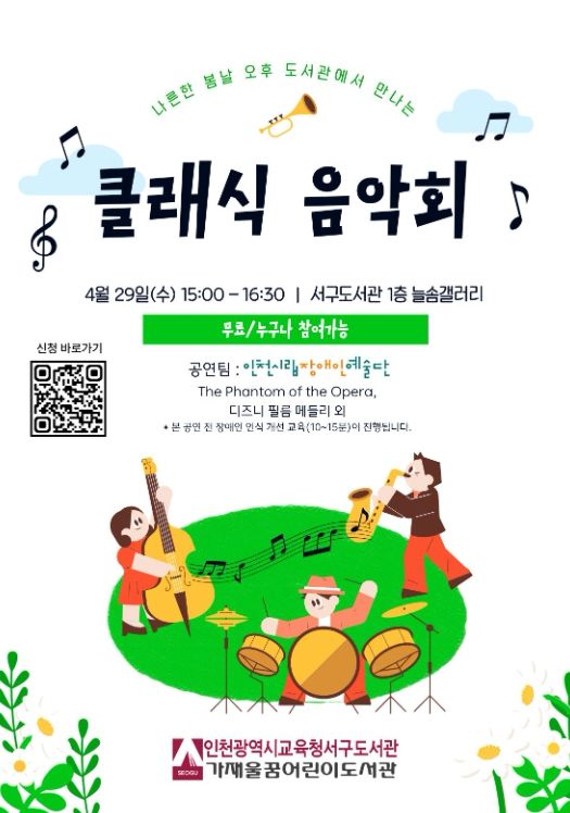 【뉴스라이트 = 이세현 기자】 인천광역시교육청서구도서관은 오는 29일 오후 3시, 도서관 내 늘솜갤러리에서 지역 주민과 함께하는 ‘클래식 음악회’를 개최한다.