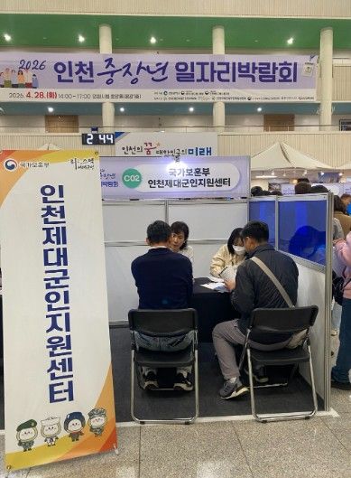 【뉴스라이트 = 이세현 기자】 국가보훈부 인천보훈지청 제대군인지원센터는 2026. 4. 28.에 인천광역시 주최로 개최된 ‘2026 인천 중장년 일자리박람회’에 협업기관으로 참여하여 중장년 제대군인의 효율적인 취업지원을 위한 구인구직 행사를 진행했다.