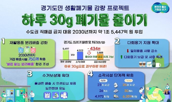 【뉴스라이트 = 조용은 기자】 수도권 직매립 금지에 따른 생활쓰레기 감량을 위해 경기도가 2030년까지 5년간 약 1조 5,447억 원을 투입하는 ‘하루 30g, 도민실천형 생활폐기물 감량 프로젝트’를 추진한다.