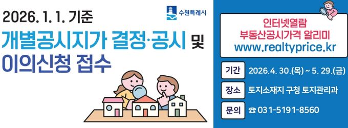 【뉴스라이트 = 조용은 기자】 수원시 영통구는 2026년 1월 1일 기준 개별공시지가를 4월 30일 결정·공시하고, 5월 29일까지 이의신청 기간을 운영한다.