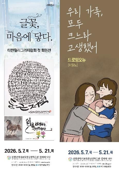 【뉴스라이트 = 이세현 기자】 인천광역시교육청평생학습관은 5월 7일부터 21일까지 관내 갤러리 '나무'와 '다솜'에서 '글꽃, 마음에 닿다'와 '우리 가족, 모두 크느라 고생했어' 전시를 각각 개최한다.