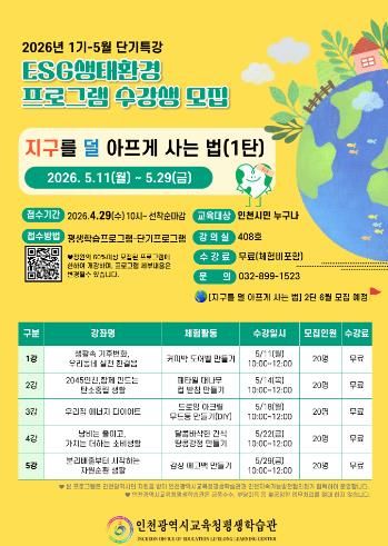 【뉴스라이트 = 이세현 기자】 인천광역시교육청평생학습관은 4월 29일부터 인천시민을 대상으로 '지구를 덜 아프게 사는 법' ESG 생태환경 프로그램 1기 수강생을 모집한다.