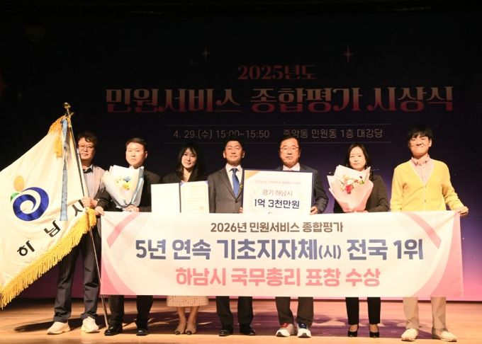 【뉴스라이트 = 김정민 기자】 하남시가 전국 기초자치단체 중 최고 수준의 민원서비스 역량을 인정받으며 5년 연속 최우수 기관으로 선정됐다. 하남시는 29일 정부세종청사에서 열린 ‘2025년 민원서비스 종합평가’ 우수기관 시상식에서 국무총리 표창을 수상했다고 밝혔다.
