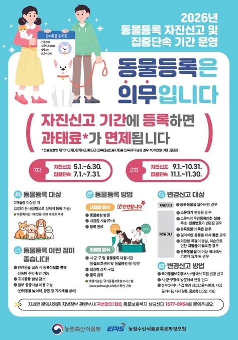 장세환 인천시 농축산과장은 “반려견 등록은 책임 있는 반려문화 정착을 위한 기본 의무”라며 “미등록 또는 변경신고를 하지 못한 경우 자진신고 기간을 적극 활용해 주시길 바란다”라고 말했다.