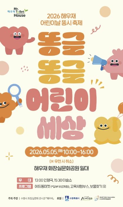 【뉴스라이트 = 조용은 기자】 ‘2026 해우재 어린이날 똥시 축제-똥글똥글 어린이 세상’이 5월 5일 오전 10시부터 오후 4시까지 해우재 화장실문화공원 일원에서 열린다.