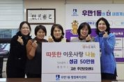【뉴스라이트 = 조용은 기자】 수원 고은 주간보호센터는 지난 12월 9일, 관내 어려운 이웃을 돕기 위해 수원시 팔달구 우만1동에 성금 50만 원을 기부하며 따뜻한 마음을 전했다. 권은주 고은 주간보호센터장은 “연말연시 어려움을 겪는 이웃들에게 작은 힘이 되길 바라는 마음으로 준비했다”며 “모두가 건강하고 따뜻한 연말을 보내시길 바란다”고 전했다. 또한 “앞으로도 지역사회를 위한 사회공헌 활동을 꾸준히 이어가겠다”며 지속적인 나눔 의지를 밝혔다. 이에 김미라 우만1동장은 “늘 지역을 위한 사랑을 실천해 주시는 고은 주간보호센터에 깊이 감사드린다”며 “전달해 주신 소중한 성금이 꼭 필요한 이웃들에게 따뜻하게 전달되도록 하겠다”고 감사의 뜻을 전했다. 우만1동 행정복지센터는 연말을 맞아 다양한 이웃돕기 활동을 통해 지역 내 취약계층 지원에 더욱 힘쓸 계획이다.