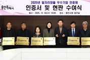 【뉴스라이트 = 박현서 기자】 용인특례시는 3일 본관 4층 전겹실에서 일자리 창출에 힘쓴 지역 우수기업 8곳에 인증서와 현판을 수여했다. 이번에 선정된 기업은 ▲아산디앤씨 주식회사 ▲일승푸드 제2공장 ▲주식회사 에이치에스씨 ▲㈜인실리코젠 ▲주식회사 홈체크 ▲㈜휴먼인텍 ▲케이제이건설산업(주) ▲트루션 등 총 8개사다. 시는 1차 서류심사와 2차 현장실사를 거쳐 일자리 창출 실적, 고용 안정성, 기업의 성장 가능성, 근로환경 등을 종합적으로 평가해 우수기업을 선정했다. 이들 기업은 최근 1년간 총 74명(기업당 4~19명)을 신규 채용해 지역 내 일자리 창출에 기여했다. 또, 다양한 직원복지제도로 근무하기 좋은 환경을 조성해 일자리의 질을 높이는 데 크게 힘쓴 것으로 평가됐다. 이들 기업에는 인증서와 현판이 수여되며, 시가 주최하는 일자리사업, 기업지원사업 참여 시 가점이 주어진다. 일자리박람회 등 채용 행사에도 우선적으로 참여할 수 있다. 용인특례시 일자리창출 우수기업 인증제는 2018년부터 시행되고 있으며, 매년 고용 확대와 일자리 창출에 기여한 기업을 발굴·지원하고 있다.