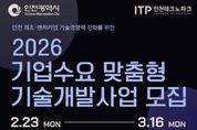 【뉴스라이트 = 이세현 기자】 인천테크노파크(인천TP)는 지역 제조벤처기업의 기술경쟁력 강화를 위해 ‘2026년 기업수요 맞춤형 기술개발사업’의 참여기업을 오는 3월 16일까지 모집한다고 밝혔다. 이번 사업은 인천 소재 제조벤처기업 중, 최근 5년 이내에 민간 액셀러레이터(AC)나 벤처캐피탈(VC) 등 적격 투자기관으로부터 투자를 유치한 기업을 대상으로 한다. 총 6개 내외의 과제를 선정해 기업당 최대 7,500만 원의 기술개발비를 지원할 계획이다. 지원금은 신규 채용 인건비, 전문가 활용비, 시제품 제작 및 성능 시험·평가 등 사업화와 상용화에 필요한 제반 비용으로 활용할 수 있다. 특히 선정 기업은 스케일업TIPS 운영사를 통해 지식재산권(IP) 경영진단 등의 컨설팅을 받게 된다. 이 중 성과가 우수한 기업은 스케일업TIPS 운영사로부터 10억 원 규모의 직접 투자와 함께 스케일업TIPS 프로그램 추천 기회를 얻을 수 있다. 최종적으로 스케일업TIPS에 선정되면 향후 3년간 총 20~30억 원의 R·D 자금을 후속 지원을 받을 수 있다. 사업 신청은 3월 1