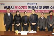 【뉴스라이트 = 이양지 기자】 군포시는 17일 시청 3층 중회의실에서 ‘2025년 군포시 우수기업 인증서 및 현판 수여식’을 열고 5개 우수기업에 인증서와 현판을 수여했다. ‘우수기업 선정사업’은 2022년부터 시작하여 올해 4번째로 추진하는 사업으로 일자리 창출, 세수 증대 등 지역경제 활성화에 기여한 기업을 선정하여 인센티브를 부여하는 사업이다. 선정된 우수기업은 인증기간(3년) 동안 군포시 중소기업 육성자금 지원 시 추가 이차보전, 군포시 관내 공영주차장 이용 시 주차요금 감면, 협약병원 의료비 지원 등의 인센티브가 부여된다. 하은호 군포시장은 “어려운 경제 상황 속 관내 우수한 기업에 활력을 불어넣기 위한 우수기업 선정사업에 관심 가져주심에 감사드리며, 앞으로도 기업지원 사업을 다각화하여 기업 경영하기 좋은 환경을 만들겠다”고 말했다. 올해 선정된 군포시 우수기업은 △(주)아이씨에이치 △㈜지비티코리아 △주식회사예선테크 △듀라텍 주식회사 △㈜트리플닷 으로 총 5개 기업이다.