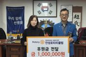 【뉴스라이트 = 박현서 기자】 안성시동부무한돌봄네트워크팀은 지난 26일 국제로타리 3600지구 안성로타리클럽으로부터 촘촘한 복지 안전망 구축을 위한 후원금 100만 원을 전달받았다. 안성로타리클럽은 매년 지역사회를 위한 봉사와 나눔을 실천하며 지역 발전에 기여해 왔으며, 이번 후원금은 복지 사각지대 발굴과 사례관리 대상자에게 전문적인 복지 서비스를 제공하는 데 사용될 예정이다. 안성로타리클럽 이승재 회장은 “현장에서 발로 뛰며 소외된 이웃을 찾는 안성시동부무한돌봄네트워크팀의 활동에 실질적인 도움이 되길 바란다”며 “앞으로도 지역사회의 다양한 사회공헌 프로젝트를 통해 지역 복지 서비스의 질을 높이는 마중물이 되겠다”고 말했다. 안성시동부무한돌봄네트워크팀 정은주 센터장은 “복지 사업을 더욱 안정적이고 원활하게 추진할 수 있도록 도움을 주신 안성로타리클럽에 깊이 감사드린다”며 “지역 주민에게 필요한 맞춤형 복지 서비스를 제공하는 데 최선을 다하겠다”고 말했다