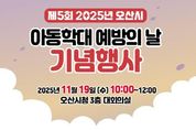 【뉴스라이트 = 조용은 기자】 오산시는 오는 19일 ‘아동학대예방의 날’과 ‘아동학대예방주간’을 맞아 기념행사 및 온·오프라인 캠페인을 실시한다고 12일 밝혔다. 행사는 19일 오전 10시부터 12시까지 오산시청 대회의실에서 진행되며, ▲1부 아동학대예방의 날 기념식 식전공연, 유공자 표창 시상, 퍼포먼스, ▲2부 부모교육 특별강연으로 구성된다. 특별강연은 리플러스 인간연구소 박재연 소장이 ‘부모를 위한 건강한 대화방법’을 주제로 진행한다. 매년 11월 19일은 아동학대 예방과 방지에 대한 사회적 관심을 높이기 위해 제정된 법정기념일로, 오산시는 매년 기념식과 강연, 캠페인 등을 통해 아동학대 예방의 중요성을 알리는 다양한 활동을 추진해오고 있다. 시는 이달 25일까지 온라인 릴레이 캠페인도 함께 진행한다. 오산시민 누구나 SNS에 아동학대예방 메시지 또는 관련 사진을 업로드해 참여할 수 있다. 또한 11월 24일에는 시청 인근 주요 교차로에서 시민 대상 오프라인 홍보 캠페인을 실시해 아동학대 예방 인식 제고에 나설 예정이다. 박현주 아동복지과장은 “이번 행사가 아동학대 예방의 중요성을 되새기고 아