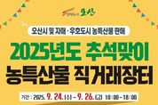【뉴스라이트 = 조용은 기자】 오산시는 민족 최대 명절 추석을 맞아 오는 24일(수)부터 26일(금)까지 3일간 오산시청 광장에서 ‘추석맞이 자매도시 농특산물 직거래장터’를 개최한다고 밝혔다. 올해 직거래장터에는 영동군, 속초시, 순천시, 진도군, 남해군, 장수군, 남원시, 공주시, 오산시 등 총 9개 시군에서 24개 업체가 참여한다. 규모 있는 장터답게 제수용품부터 선물세트까지 명절 상차림에 필요한 다양한 특산품을 만나볼 수 있다. 영동군의 포도·곶감·와인, 속초시의 젓갈류·명태강정, 순천시의 홍차·전통장, 진도군의 김·전복·울금, 공주시의 햇밤과 장류, 남원시의 강정·추어탕, 오산시의 세마쌀·전통주·호두정과 등 전국 각지의 특산품이 한자리에 모인다. 시중보다 저렴하게 판매돼 시민들의 장바구니 부담을 덜어줄 전망이다. 시는 이번 장터를 통해 자매·우호도시 농가에는 안정적인 판로를 제공하고, 시민들에게는 믿을 수 있는 농특산물을 만날 수 있는 기회를 마련해 도농 상생의 의미를 더할 계획이다. 이권재 오산시장은 “추석 장터를 통해 시민들께서 질 좋은 농특산물을 합리적인 가격에 구입하시고, 자매·우호도