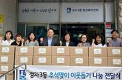 【뉴스라이트 = 조용은 기자】 수원시 장안구 정자3동은 지난 19일, 추석 명절을 앞두고 관내 어려운 이웃들을 위한 이웃돕기 나눔 전달식을 가졌다. 이날 전달식에서 기부된 식료품 꾸러미는 주민자치회 33박스, 통장협의회 17박스, 단체장협의회 10박스로, 전달받은 물품은 관내 기초생활수급자 등 생활이 어려운 가구에 전달될 예정이다. 이판수 주민자치회장은 “추석을 맞아 우리 이웃이 풍요로운 한가위를 보내는 데 도움이 될 수 있도록 앞으로도 각 단체 회원들이 앞장서겠다.”고 말했다. 송근숙 정자3동장은 “어려운 이웃을 위해 나눔의 손길을 내밀어주셔서 깊은 감사의 말씀을 전한다”며, “지원해주신 물품은 도움이 필요한 분들에게 잘 전달될 수 있도록 세심히 살피겠다”고 전했다.