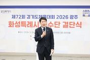 【뉴스라이트 = 조용은 기자】 화성특례시의회는 26일 화성종합경기타운 3층 라운지홀에서 열린 제72회 경기도체육대회 화성시 선수단 결단식에 참석해 선수단을 격려하고 4연패 달성을 위한 결의를 다졌다. 이날 행사에는 배정수 의장을 비롯해 김종복 문화복지위원장, 송선영·이용운 의원, 화성시체육회 임원과 종목단체 관계자, 선수단 등 약 150여 명이 참석했다. 이날 결단식은 경기도체육대회 출전을 앞둔 선수단의 사기를 높이고 각오를 다지는 자리로 마련됐다. 화성특례시 선수단은 오는 4월 16일부터 18일까지 광주시 일원에서 열리는 제72회 경기도체육대회에 출전한다. 육상, 수영, 축구 등 27개 종목에 참가해 종합우승 4연패에 도전한다. 배정수 의장은 “묵묵히 쌓아온 훈련의 시간과 노력을 믿고 끝까지 당당하게 경기에 임해주시기 바란다”며 “선수 여러분의 땀과 투혼이 화성특례시의 자부심”이라고 말했다. 이어 “화성특례시의회도 선수들이 오직 경기에 집중할 수 있도록 체육 환경 조성과 지원에 최선을 다하겠다”며 “4연패 달성을 진심으로 기원한다”고 덧붙였다. 화성특례시의회는 선수들이 충